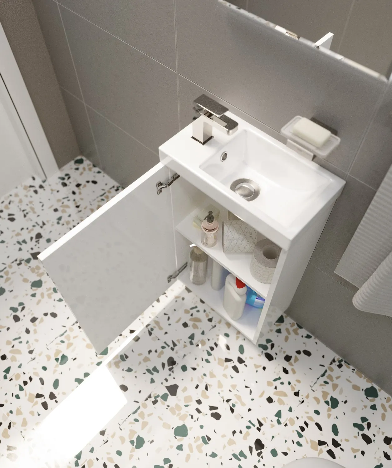 Компактная тумба, корпус которой покрыт пленкой ПВХ для дополнительной защиты от воздействия влаги и сохранения привлекательного, презентабельного внешнего вида. Это безупречный вариант для небольших ванных комнат, который позволяет с удобством организовать хранение косметики, бытовой химии и других вещей даже в условиях дефицита пространства. Это модель, с выбором которой просто невозможно ошибиться. Стильная и универсальная, она будет одинаково уместна как в классических, так и в современных и эклектичных интерьерах вне зависимости от их цветовой гаммы.